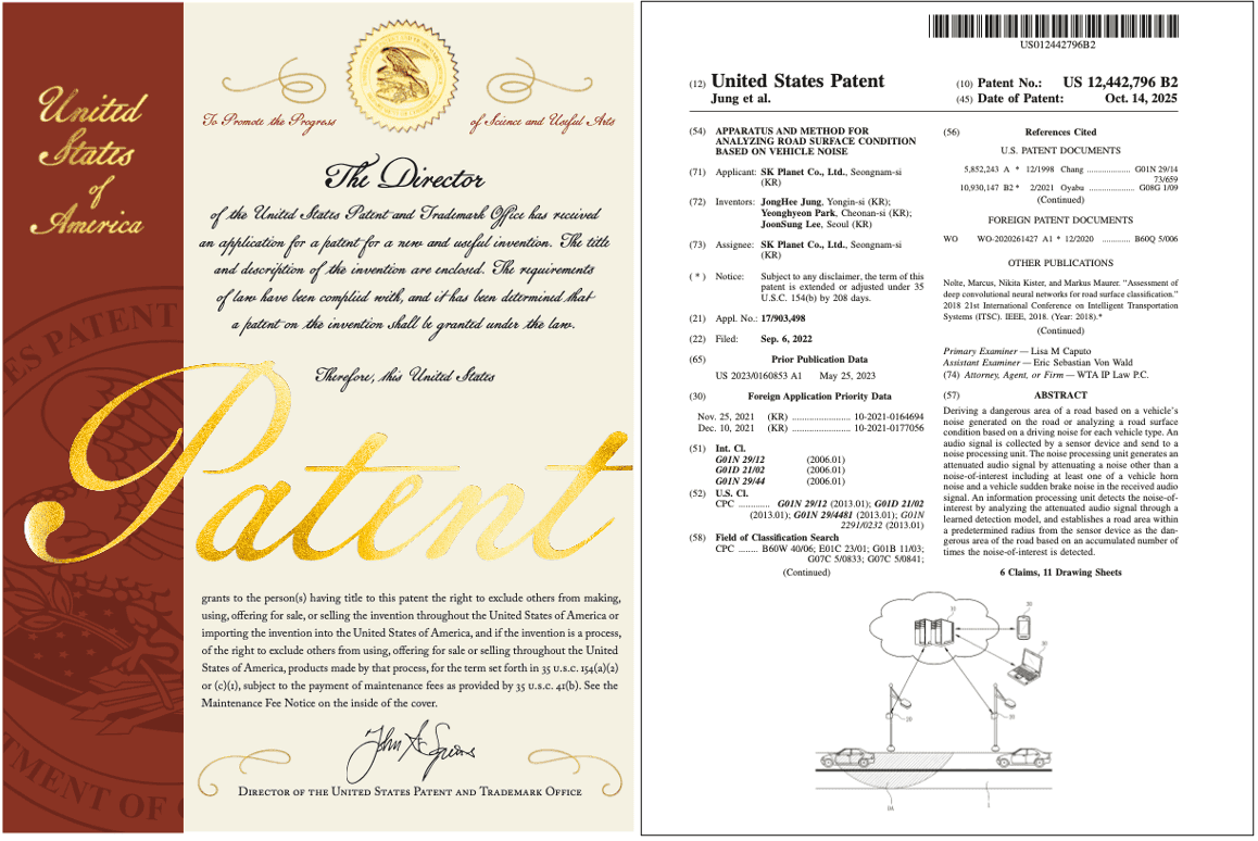결빙감지 솔루션은 60여건 이상의 특허 포트폴리오를 구축했으며, 25년 10월에 미국 등록 특허(US 12,442,796 B2)가 발행되었습니다.