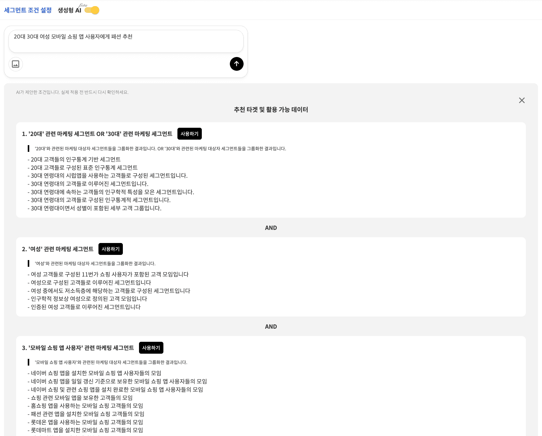 입력된 세그먼트를 기반으로 관련 키워드나 유사 고객군을 자동 제안합니다.