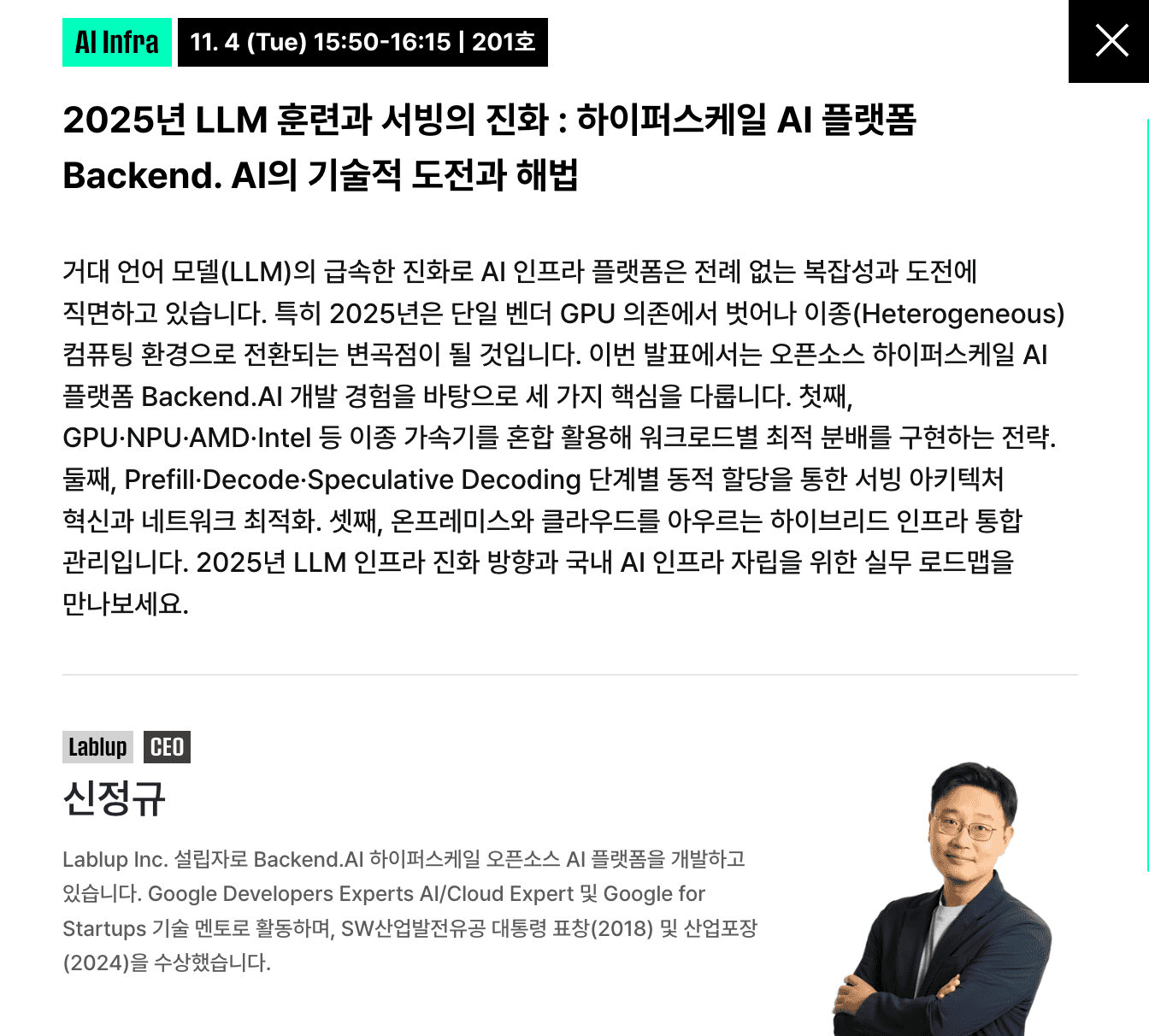 독특한 AI 인프라 매니지먼트 사업모델을 표방하며 흑자까지 내고 있는 래블업의 대표 플랫폼 Backend.AI의 테크 인프라 관점에서의 기술 세션입니다(참고로 래블업은 구글 등 투자를 받고 있으며 속도 등의 이슈로 k8s를 적용하지 않는 것으로도 잘 알려져 있죠). 본 세션에서는 특히 이종 컴퓨팅 환경을 활용하여 워크로드를 분배하고 단계별 동작 할등을 통한 서빙 아키텍처 혁신, 네트워크 최적화 및 하이브리드 인프라 통합 관리의 구현입니다. 테크 인프라 기반 AI를 좀더 파보고 싶은 참가자 분들께 권해드립니다.