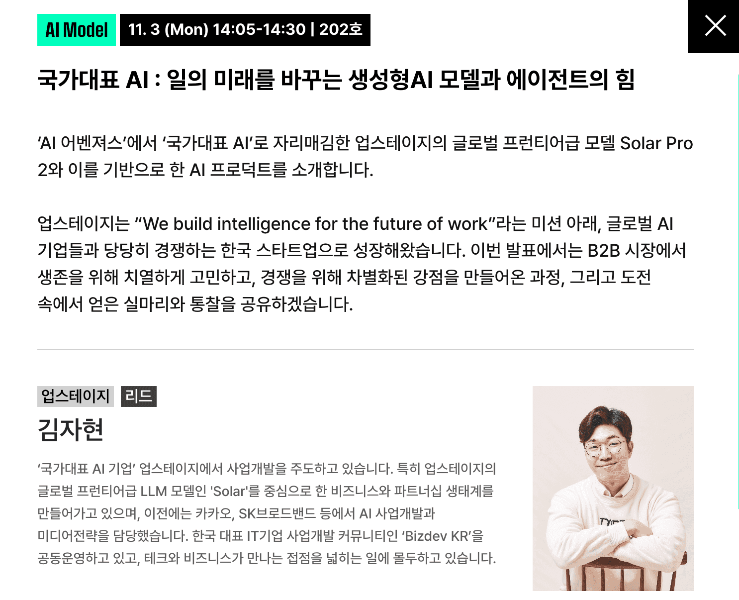 5대 국가대표 AI 기업 중 유일한 스타트업으로 글로벌 수준의 기술력을 자랑하는 업스테이지의 세션입니다. 프런티어급 모델 솔라 프로 2를 기반으로 한 다양한 국내외 사업 도메인에서의 AI 프로덕트를 이번 세션에서 소개할 예정이오니 참고하시기 바랍니다(참고로 9월 말 과기정통부 주관으로 코엑스에서 진행되었던 AI Festa에서 업스테이지 다른 분의 발표 세션에 참여했었는데요, 이 세션도 개인적으로 기대가 됩니다).