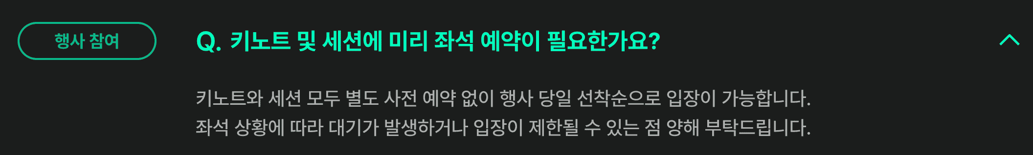 이 글을 작성하는 10/28 현재 사전 참가신청은 벌써! 마감되었습니다. 그러나! 행사 당일 현장에 오셔서 '현장 신청(행사당일 세션별 신청)' 을 하시면 되는데요, 참고로 작년의 경우 행사 약 30분-1시간 전에 행사장 각 장소에 비치된 QR코드에 선착순 현장등록을 했습니다(인기 세션의 경우 줄을 섰던 기억이...).