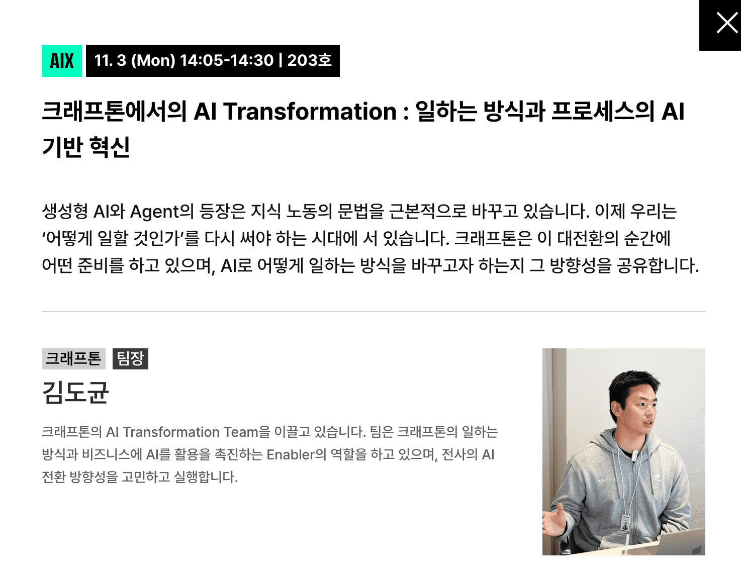 최근 AI Native/Design/시너지 등 AIX(AI Transformation)을 위해 기업 내 변화를 주도하는 전담부서를 두는 곳이 많이 생겼고 사례들도 점점 많이 공유되고 있습니다. 혁신적인 게임회사 크래프톤의 AIX조직을 이끄는 김도균 팀장님의 'Enabler로서의 AI'를 활용한 일하는 방식의 전환 사례가 기대됩니다(참고로 SK에서도 이른바 'AI 일.방.혁(일하는 방식의 혁신)'을 위해 하이닉스 등 주요 회사에서 적극적으로 움직이고 있다고 합니다). 아, 크래프톤 AI 웹사이트가 별도로 있으니 함께 참고하세요.