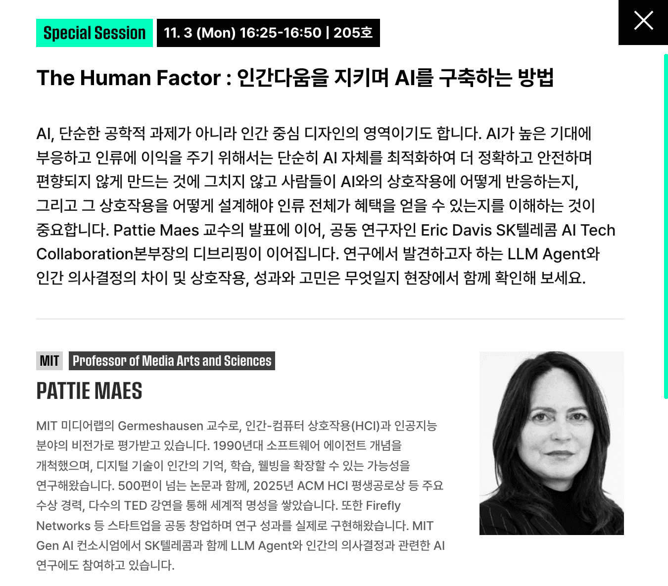 20세기 AI와 소프트웨어 에이전트의 '레전드'이신 MIT Media Lab의 Pattie Maes 교수님이 라인업에 있었네요! 저도 자세히 안 들여다봤으면 그냥 넘길 뻔했습니다(예전에 수도 없이 논문을 다운로드받았던 기억이 나네요. 예를 들어 'Agent-mediated Eletronic Commerce' 같은). 벨기에 출신의 컴퓨터 과학자이자 혁신적인 HCI 연구자, 1990년대 Software Agents 개념을 제시하신 것으로 학계에는 너무나 잘 알려져 있습니다. MIT Media Lab이 유명해지게 된 것도 이분 덕분(!)이라고 굳게 믿는 1인이기도 합니다 ㅎㅎ 섭외해 주신 AI SUMMIT 사무국에 감사드립니다.