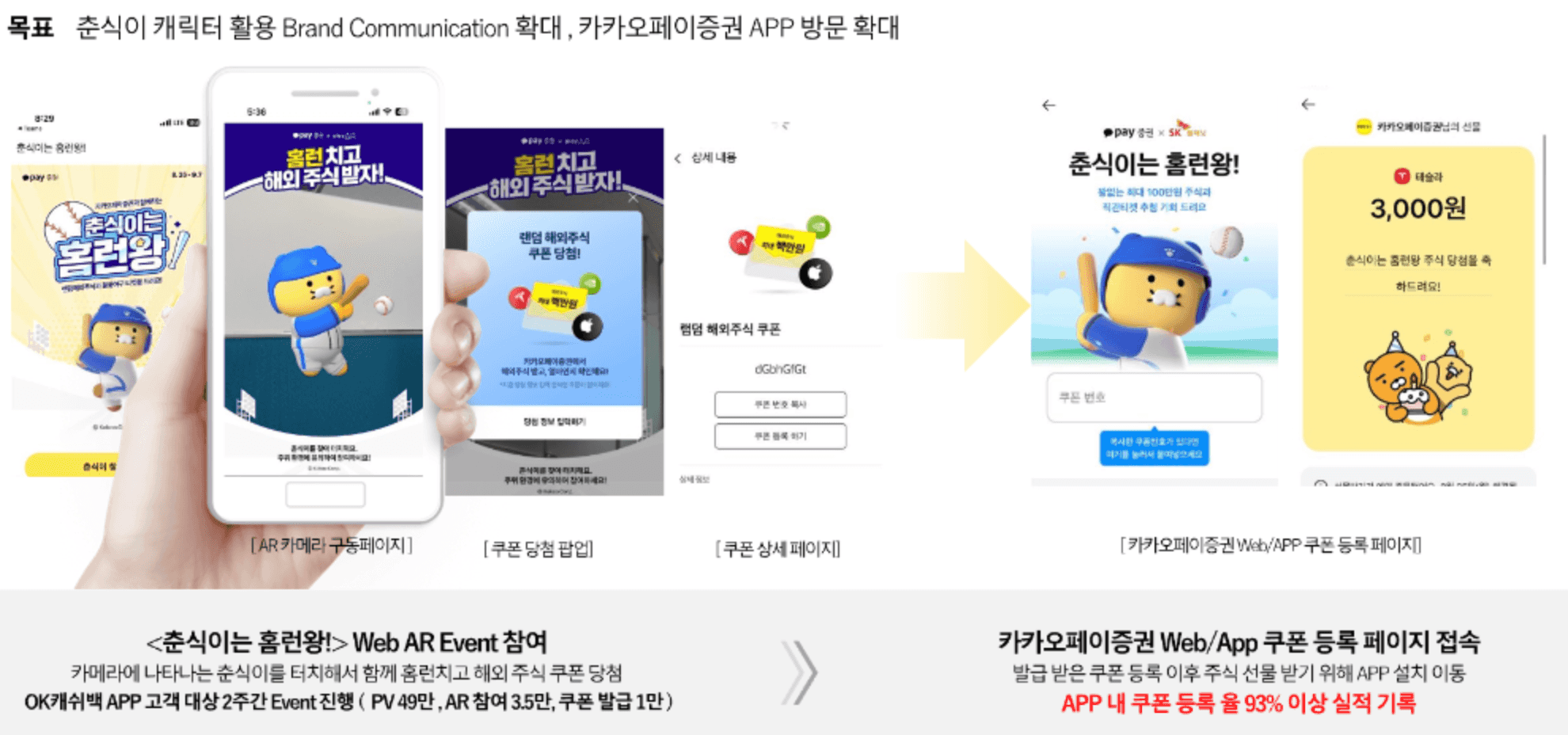 가장 대표적인 최근 사례로는 카카오페이증권과 진행한 '춘식이는 홈런왕!' Web AR 이벤트 사례가 있으며, 그밖에도 많은 사례가 있사오니 참고하시기 바랍니다.