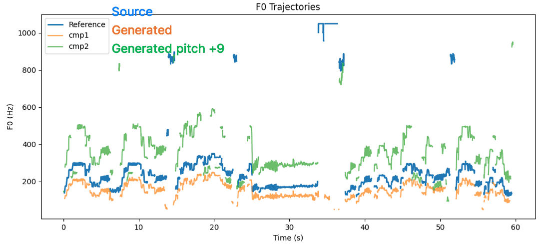 아래 그래프는 Source(파란색), Generated(주황색), 그리고 +9반음(semitone) 만큼 인위적으로 높인 Generated(초록색) 의 F₀ 변화를 나타냅니다.