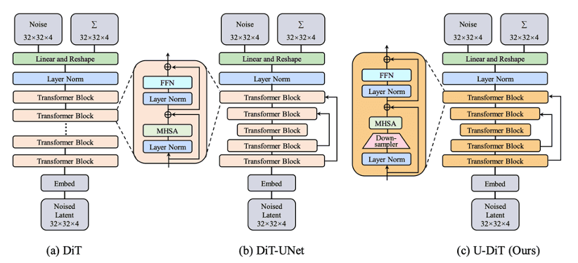 Comparison of DiT, DiT-UNet, and U-DiT architectures.