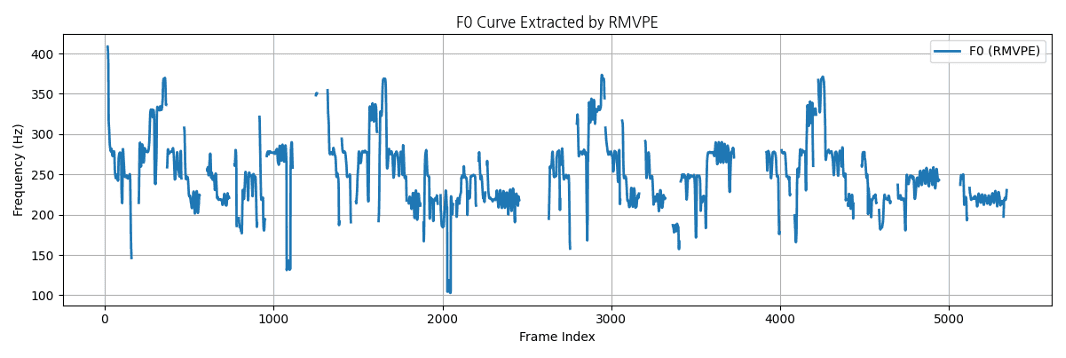 Pitch Extractor는 음성 신호에서 시간에 따른 기초주파수(F₀, Fundamental Frequency) 변화를 추출하여 음성의 높낮이(pitch) 패턴을 시각적으로 표현하는 과정입니다. 아래 그래프는 시간 프레임(Frame Index)에 따라 피치가 어떻게 변하는지를 보여줍니다.