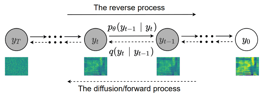 Diffusion process: forward adds noise, reverse reconstructs Mel-Spectrogram.