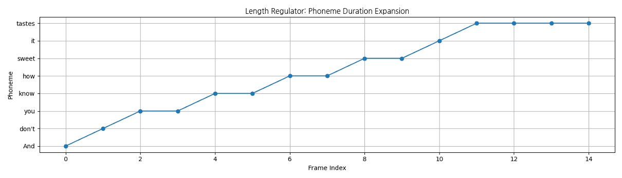 Length Regulator aligns phoneme durations to match acoustic frame lengths.