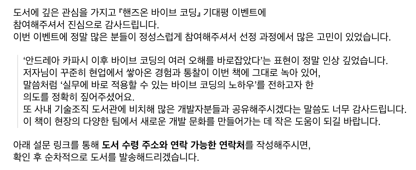 실은 지난 10월, 한빛미디어에서 로보코 정도현님의 최신간 '핸즈온 바이브 코딩' 기대평 이벤트가 올라와서 매우 가벼운 마음으로 응모를 하였습니다. 당첨이 되면 저희 테크 미니 도서관에 기증을 하고 싶다는 순수한(!) 문구를 적었는데 그만 저의 진심이 하늘에 닿고 말았다는...