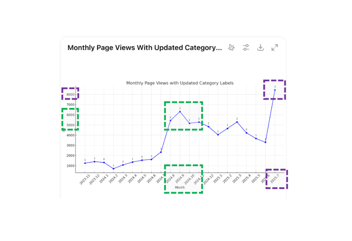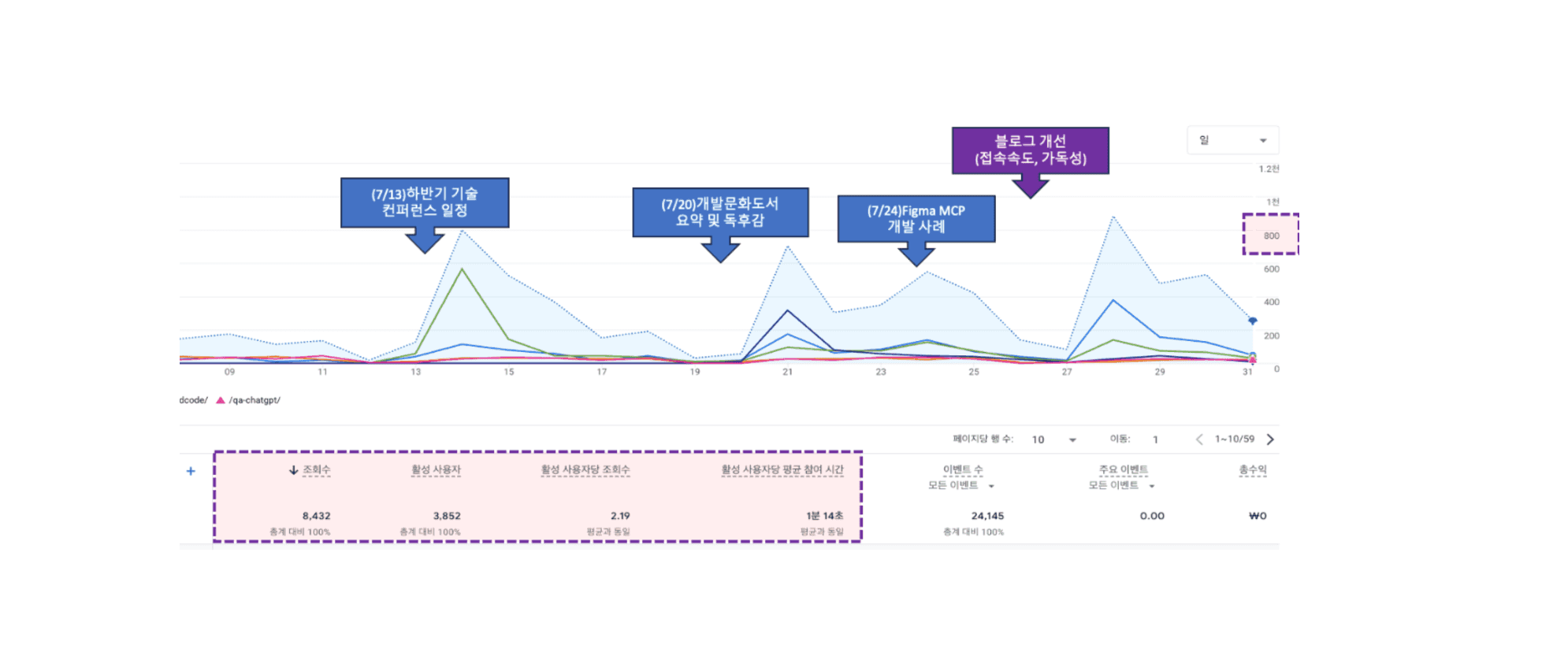 2025년에는 월 1회 수준으로 운영하였으며 월평균 3천-5천 PV 수준으로 조금 떨어졌는데요. 7월에 반전을 위한(!) 블로그 개선을 포함한 컨텐츠 실험을 하게 됩니다(결론부터 말씀드리면 7월 한 달간 8천+ PV로 증가하였으며 이 내용을 소개해 드리고자 합니다).
