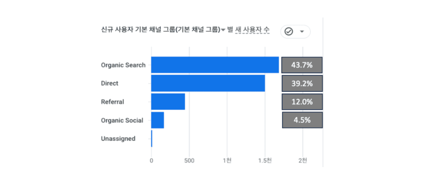 특히 Organic Search 비중이 약 43%로, 구글 검색 최적화가 잘 된 편으로 볼 수 있고 Direct 트래픽 비중도 약 39%를 차지,