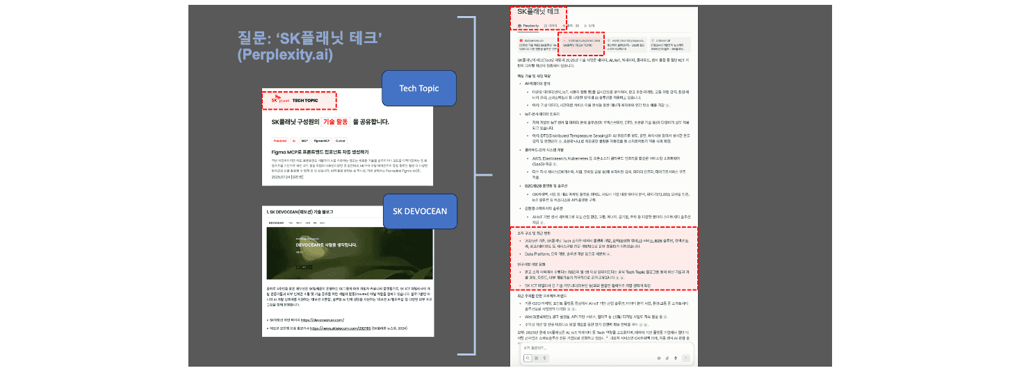아래는 Perplexity AI에서 특별한 질문 형식 없이 'SK플래닛 테크' 라고만 검색한 간단한 사례인데요,