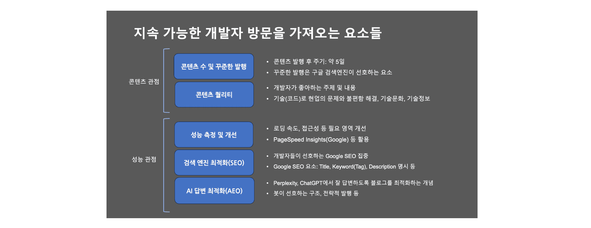 테크 블로그도 그 동안 많은 부분 검색엔진 최적화에 영향을 받아 왔고 이를 고려한 전략을 수립하여 실행해 왔으나, 이제는 AI 에이전트를 고려한 전략을 새롭게 수립하여야 합니다.