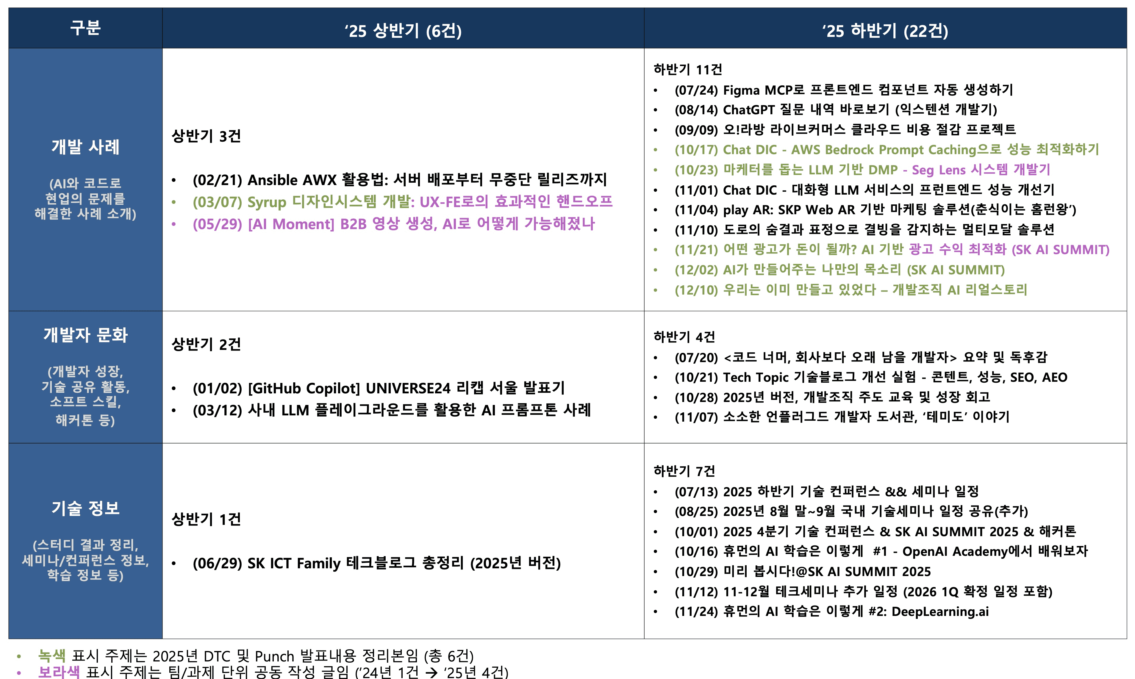 콘텐츠 집중 발행 및 카테고리 다양화: 한 달간 총 11개의 글을 발행하며 개발 사례(5건), 개발자 문화(3건), 기술 정보(3건) 등 풍성한 카테고리를 구성했습니다. 참고로 비슷한 시점에 진행되었던 SK AI SUMMIT 발표 주제의 정리 글은 이 기간 이후에 발행되었으며, 해당 기간 많은 개발자 분들이 참여해 주셔서 좋은 포트폴리오를 구성할 수 있었습니다. 이 자리를 빌어 감사의 인사를 드립니다 :)