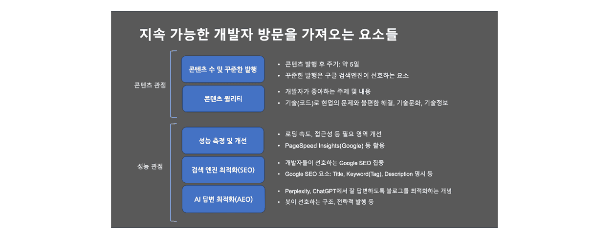 사용자 경험(UX) 최적화: 블로그 메인 배너 개편 및 로딩 속도 향상, 접근성(A11y) 강화, 그리고 SEO/AEO(검색 및 AI 답변 최적화) 개선을 통해 누구나 쉽게 기술 정보를 접할 수 있는 환경을 만들었습니다.